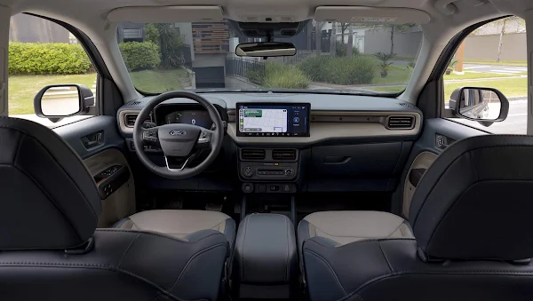 Além da tração integral, a Maverick Hybrid 2025 recebeu um banho de loja por dentro e por fora. O modelo adota um para-choque redesenhado, novos faróis em LED e rodas de 19 polegadas.